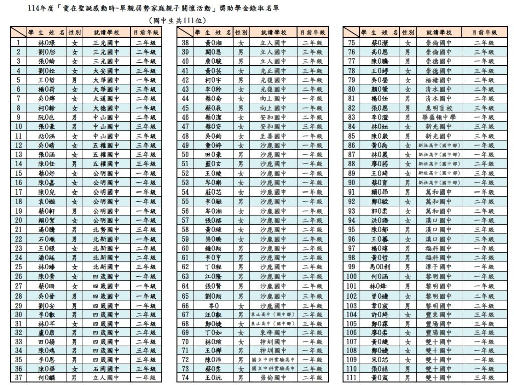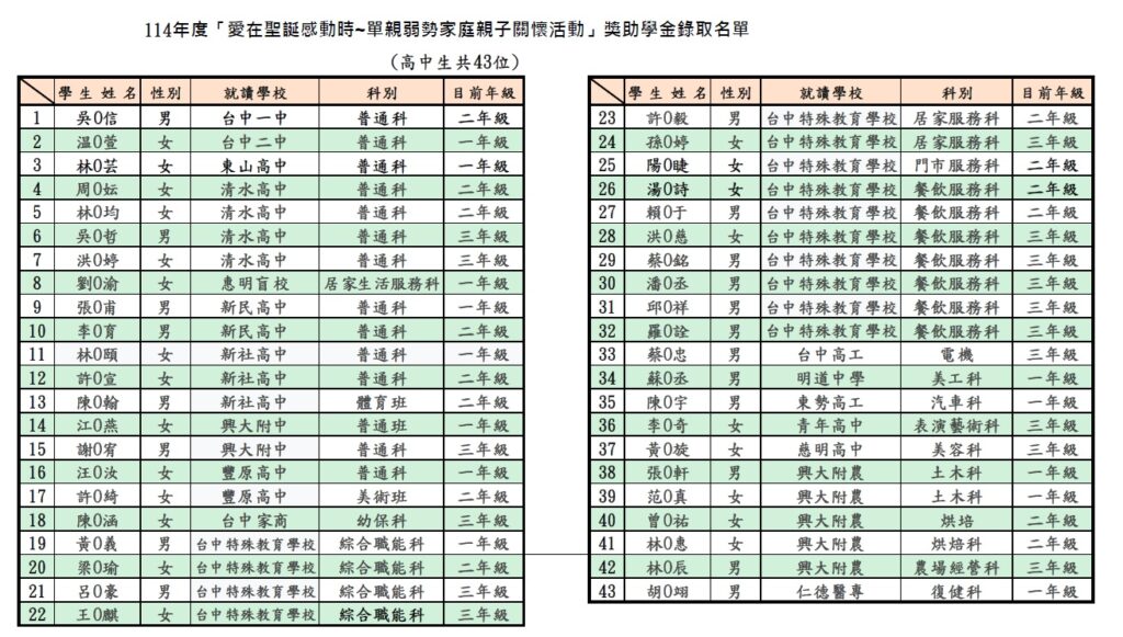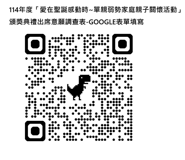 本會 114年度「愛在聖誕感動時~單親弱勢家庭親子關懷活動」獎助學金錄取名單公布囉! 獎助學金獲獎之表揚活動訂於中華民國114年12月6日,星期六下午2點 假 「臺中市立大墩文化中心」B1演講廳 (台中市西區英才路600號)舉辦。 錄取通知單將於本周陸續以平信寄出,請密切留意信箱取信喔! 獲獎學生請於活動當日下午1點半報到,攜帶”錄取通知單及身份證或健保卡正本”,並由一位家長陪同出席。 請錄取學生到以下連結 https://docs.google.com/forms/d/e/1FAIpQLSfsXsXHAghN5ew8YG7pgp_-pWXOjzaFnsaojmuEFMLnRYBZAA/viewform?usp=publish-editor 或掃描QRCODE提交出席意願調查表,未出席者,依簡章辦法規定視同放棄。